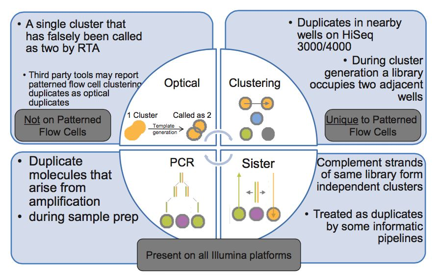 生成测序cluster的时候,某一个cluster中的DNA序列可能搭到旁边的另一个cluster的生成位点上,又再重新长成一个相同的cluster,这也是序列duplicate的另一个来源,这个现象在Illumina HiSeq4000之后的Flowcell中会有这类Cluster duplicates